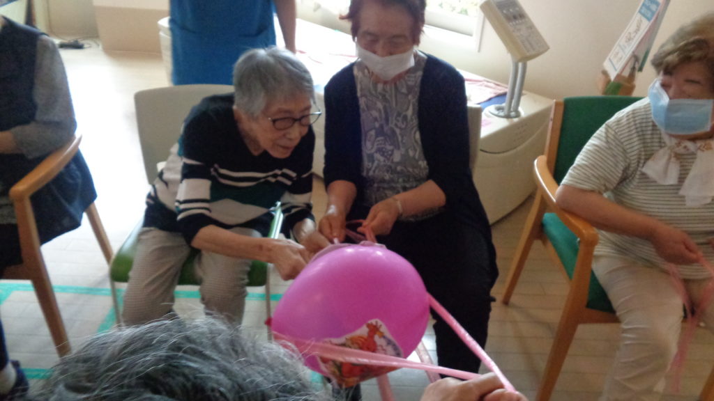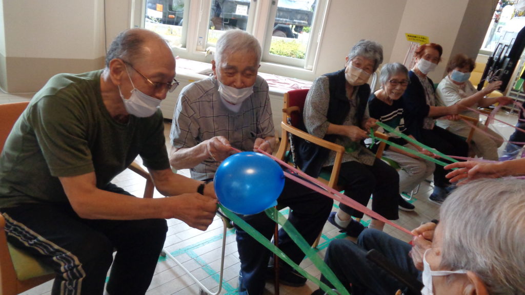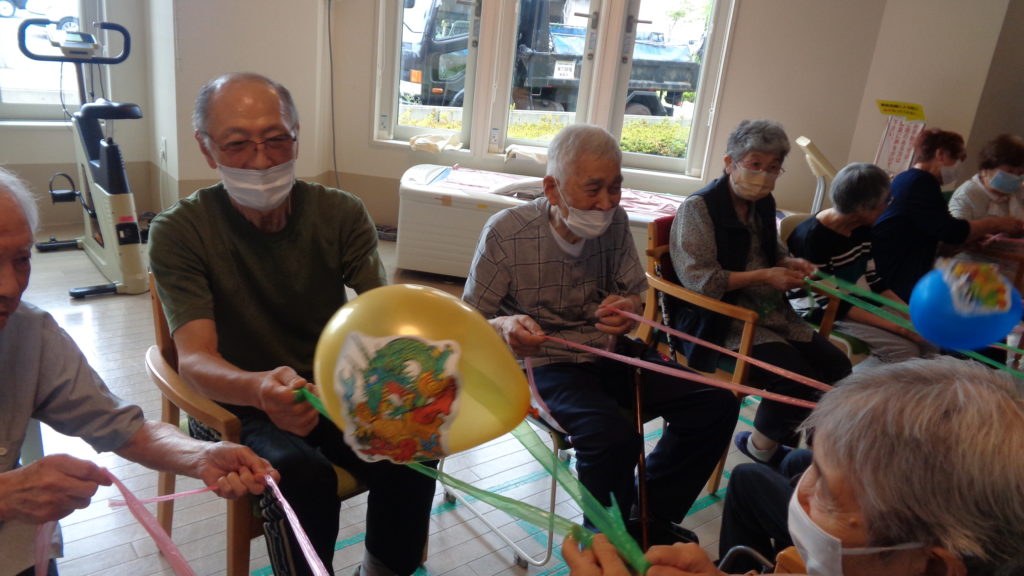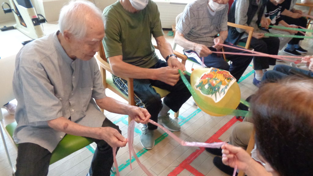 月別レクリエーションではねぶたの運行を風船ねぶたで行いました。