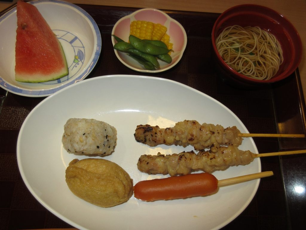 まずは軽く昼食メニュー そうめん スイカ 枝豆 焼き鳥 フランクフルト おにぎり おいなりさんです