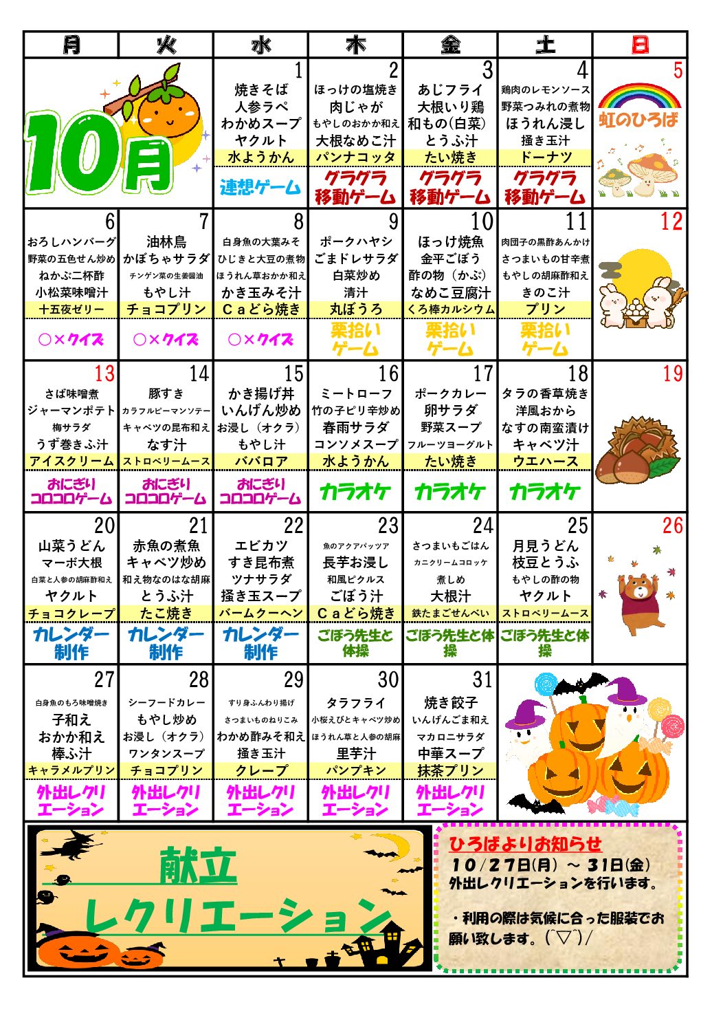 虹のひろばカレンダー2025年10月 投稿日 2025年10月1日 著者 デイサービス虹のひろば カテゴリー 新着情報 カテゴリー 虹のひろばだより・イベントカレンダー 虹のひろばイベントカレンダー 虹のひろばだより